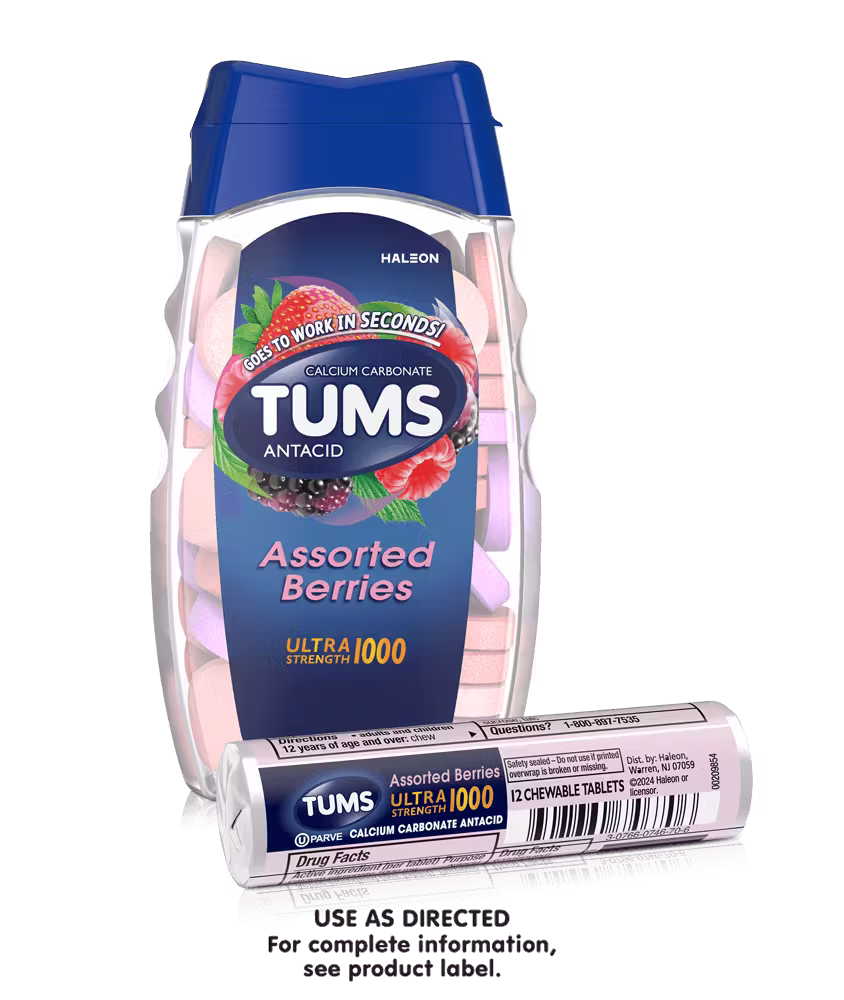 TUMS Ultra Strength 1000 Assorted Berries (12ct) is a chewable antacid tablet pack designed to provide fast relief from heartburn, acid indigestion, sour stomach, and upset stomach. It contains a high-strength formula that quickly neutralizes excess stomach acid.